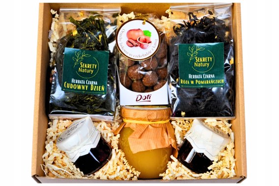 Pomysł na prezent herbata, miód, konfitury i czekoladki Doti orzech laskowy